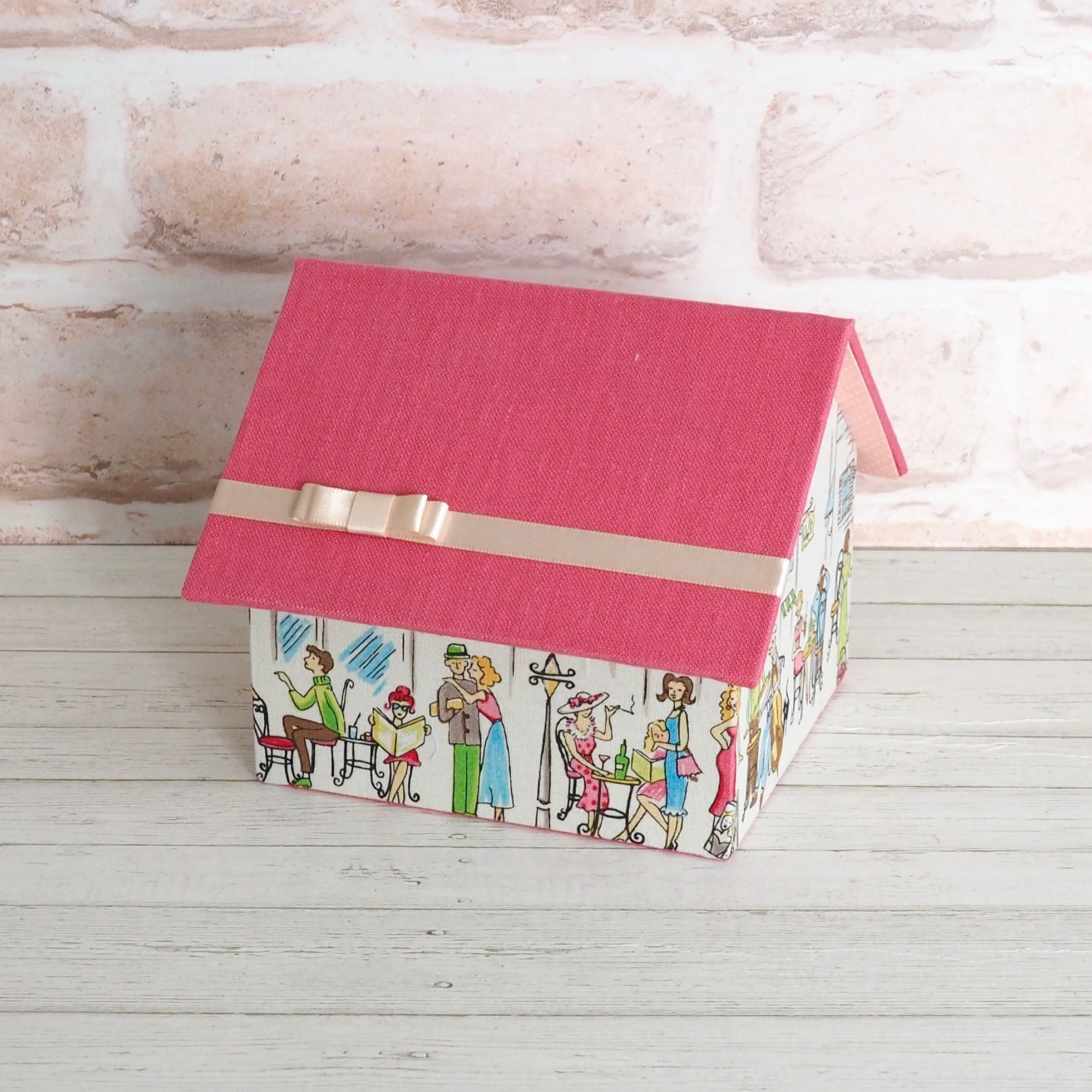 作品の出来上がりサイズ:(箱のみ)横13cm×縦12cm×高さ12cm (屋根を含)横15cm×縦15.5cm×高さ12.5cm (布の厚さ等により多少変わります)